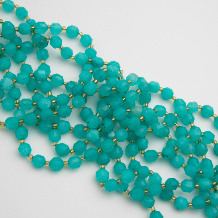 Naturalne kamienie wykonane z amazonitu w kształcie baryłki fasetowanej. Dominującym kolorem jest zielony, jednak w nieznacznym stopniu przebija się przez niego niebieski. Niektóre kamienie mają naturalne, białe wybarwienia. *Ponieważ są to kamienie naturalne mogą się nieznacznie różnić od siebie rozmiarem.*Rozmiar podany w nazwie produktu jest wartością orientacyjną. Charakterystyka: