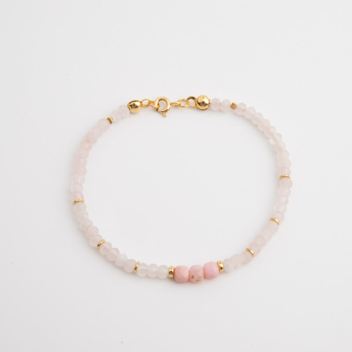 Przejdź do tutorialuOpis Bransoletka wykonana z naturalnych kostek opalu różowego oraz oponek z kryształu górskiego w mlecznoróżowym odcieniu. Kamienie nawleczono na odporną na ścieranie nić Craft, co gwarantuje trwałość i wygodę noszenia. Całość dopełniają subtelne elementy ozdobne ze srebra próby 925 pozłacanego 14-karatowym złotem.Delikatna kolorystyka w odcieniach pudrowego różu i mlecznej bieli nadaje bransoletce romantyczny, kobiecy charakter. To doskonały dodatek do jasnych, pastelowych stylizacji – zarówno codziennych, jak i bardziej eleganckich.Bransoletka będzie także pięknym i symbolicznym prezentem – opal różowy sprzyja otwartości serca i emocjonalnej harmonii, a kryształ górski uznawany jest za kamień czystości i wzmocnienia.Bransoletka będzie odpowiednia na nadgarstek o obwodzie 17–18 cm.