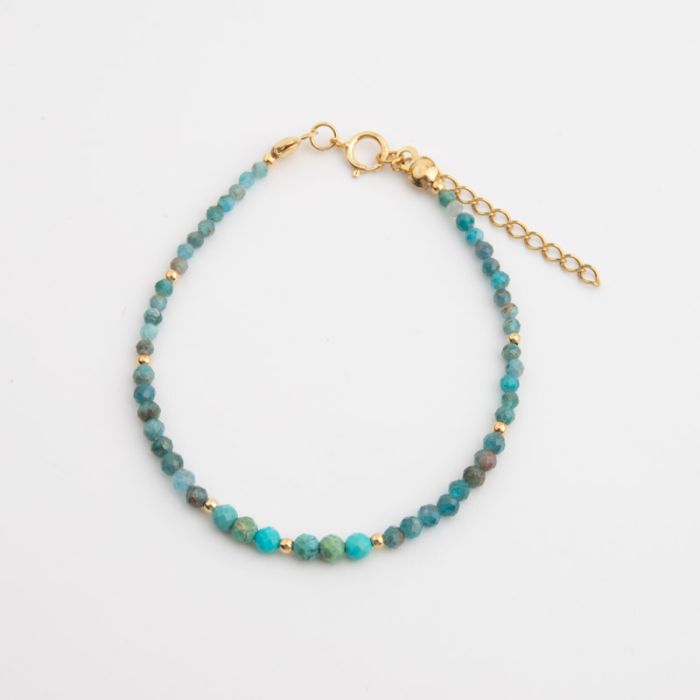 Przejdź do tutorialuOpis Bransoletka wykonana na wytrzymałej lince stalowej, ozdobiona kamieniami naturalnymi – turkusem i apatytem – w odcieniach błękitu i zieleni. Dodatki w postaci przekładek oraz zapięcia wykonano ze srebra próby 925, pokrytego 14-karatowym złotem. Regulowana długość dzięki przedłużce (do 4 cm) pozwala na idealne dopasowanie do nadgarstka. Bransoletka bedzie pasowań na nadgarstek o obwodzie od 16 do 20 cm.Apatyt i turkus to kamienie, które warto chronić przed długotrwałym działaniem wysokich temperatur – mogą stopniowo tracić intensywność barwy, dlatego zaleca się zdejmowanie bransoletki przed opalaniem.To elegancki i jednocześnie naturalny dodatek, który świetnie uzupełni zarówno codzienne, jak i letnie stylizacje. Doskonały pomysł na prezent dla osób ceniących biżuterię z duszą i znaczeniem.