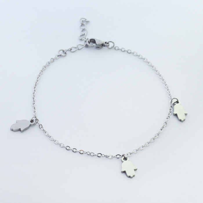 Bransoletka ze stali chirurgicznej z trzema zawieszkami ręka Fatimy w kolorze srebrnym 19,5cmTo trwały element biżuterii lub półfabrykat jubilerski, który dobrze sprawdza się w codziennych realizacjach. Stal chirurgiczna 316L dobrze sprawdza się w biżuterii noszonej na co dzień, ponieważ łączy trwałość z estetycznym wykończeniem.Bransoletka ze stali chirurgicznej 316L może pełnić funkcję gotowej ozdoby albo bazy do stworzenia własnej kompozycji handmade. Dzięki trwałemu materiałowi i estetycznemu wykończeniu dobrze sprawdza się w codziennym użytkowaniu.Rozmiar