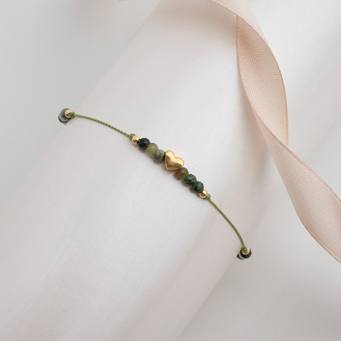 Bransoletka ze szmaragdem na zielonej nici z pozłacanym serduszkiem