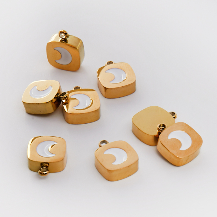 Emaliowana zawieszka ze stali chirurgicznej białym księżycem w kolorze złotym 11mm PVDTo estetyczny element biżuteryjny ze stali chirurgicznej 316L, chętnie wybierany do nowoczesnych projektów. Stal chirurgiczna 316L dobrze sprawdza się w biżuterii noszonej na co dzień, ponieważ łączy trwałość z estetycznym wykończeniem. Wykończenie w kolorze złotym uzyskane metodą PVD.Zawieszka ze stali chirurgicznej 316L to dekoracyjny element, który nadaje biżuterii charakteru i pozwala tworzyć spersonalizowane projekty. Świetnie sprawdza się w naszyjnikach, bransoletkach, kolczykach oraz drobnych charmsach.Forma lub motyw