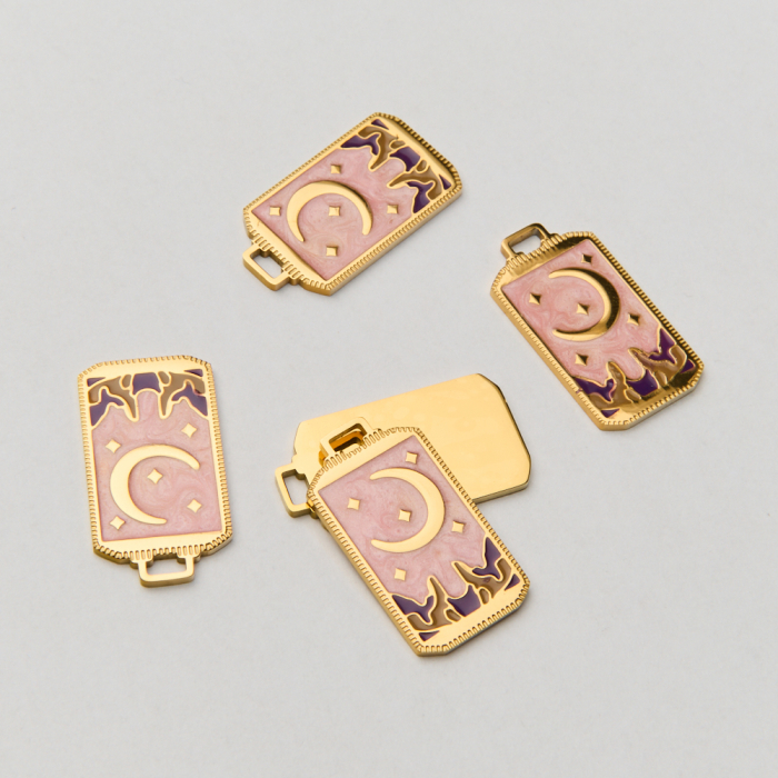 Emaliowana zawieszka ze stali chirurgicznej karta tarota księżyc na różowym tle w kolorze złotym 25,5mm PVD