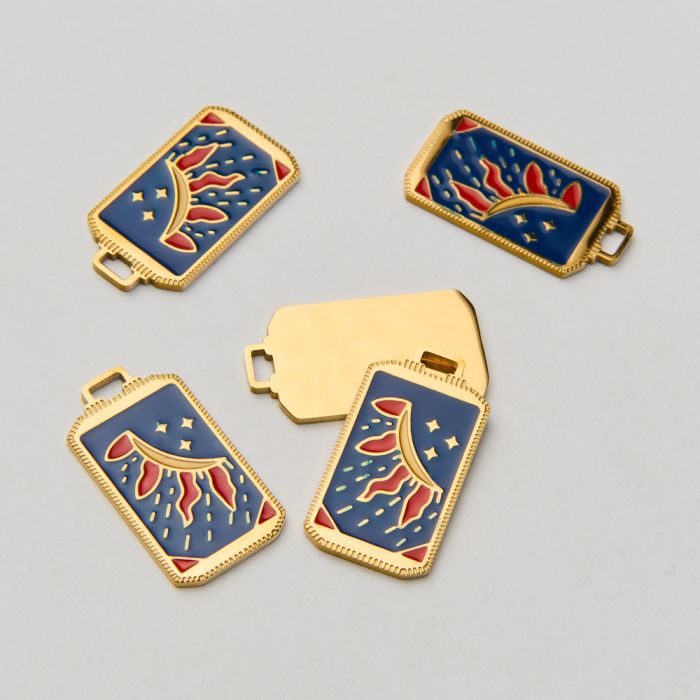 Emaliowana zawieszka ze stali chirurgicznej karta tarota płonące słońce na granatowym tle w kolorze złotym 25,5mm PVD