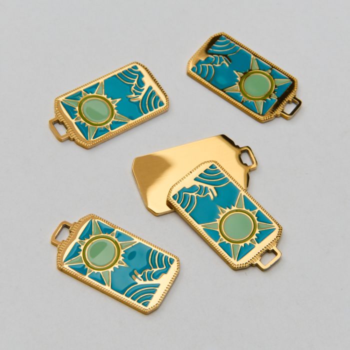 Emaliowana zawieszka ze stali chirurgicznej karta tarota zielone słońce w kolorze złotym 25,5mm PVD
