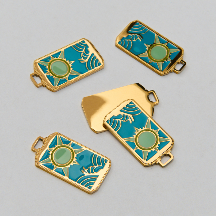 Emaliowana zawieszka ze stali chirurgicznej karta tarota zielone słońce w kolorze złotym 25,5mm PVDTo dopracowany produkt ze stali chirurgicznej 316L, który łączy praktyczność z estetycznym wyglądem. Stal chirurgiczna 316L jest ceniona za odporność na korozję i estetyczny wygląd w codziennym użytkowaniu. Wykończenie w kolorze złotym uzyskane metodą PVD.Zawieszka ze stali chirurgicznej 316L to dekoracyjny element, który nadaje biżuterii charakteru i pozwala tworzyć spersonalizowane projekty. Świetnie sprawdza się w naszyjnikach, bransoletkach, kolczykach oraz drobnych charmsach.Forma lub motyw