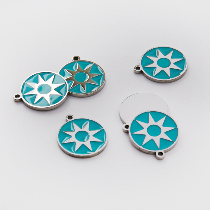 Emaliowana zawieszka ze stali chirurgicznej kółko z gwiazdą turkusową w kolorze srebrnym 18mmTo trwały element biżuterii lub półfabrykat jubilerski, który dobrze sprawdza się w codziennych realizacjach. Stal chirurgiczna 316L jest ceniona za odporność na korozję i estetyczny wygląd w codziennym użytkowaniu.Zawieszka ze stali chirurgicznej 316L to dekoracyjny element, który nadaje biżuterii charakteru i pozwala tworzyć spersonalizowane projekty. Świetnie sprawdza się w naszyjnikach, bransoletkach, kolczykach oraz drobnych charmsach.Forma lub motyw