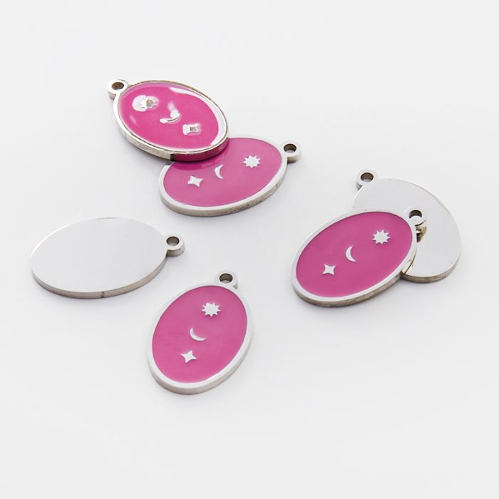 Emaliowana zawieszka ze stali chirurgicznej owal różowy ze słońcem, księżycem i gwiazdą w kolorze srebrnym 21mm