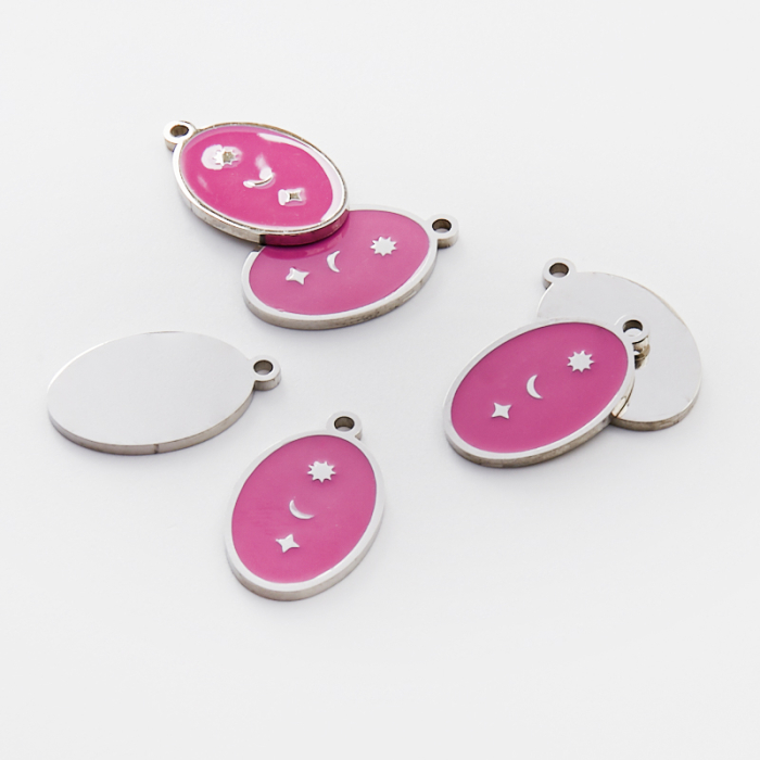 Emaliowana zawieszka ze stali chirurgicznej owal różowy ze słońcem, księżycem i gwiazdą w kolorze srebrnym 21mmTo starannie wykonany produkt ze stali chirurgicznej 316L, który dobrze prezentuje się w codziennym użytkowaniu. Stal chirurgiczna 316L jest ceniona za odporność na korozję i estetyczny wygląd w codziennym użytkowaniu.Zawieszka ze stali chirurgicznej 316L to dekoracyjny element, który nadaje biżuterii charakteru i pozwala tworzyć spersonalizowane projekty. Świetnie sprawdza się w naszyjnikach, bransoletkach, kolczykach oraz drobnych charmsach.Forma lub motyw