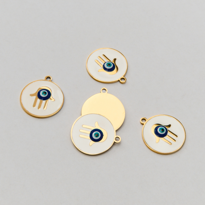 Emaliowana zawieszka ze stali chirurgicznej ręka Fatimy w stylu greckim z okiem proroka w kolorze złotym 18mm PVDTo dopracowany produkt ze stali chirurgicznej 316L, który łączy praktyczność z estetycznym wyglądem. To materiał chętnie wybierany do biżuterii handmade ze względu na trwałość, estetykę i wygodę użytkowania. Wykończenie w kolorze złotym uzyskane metodą PVD.Zawieszka ze stali chirurgicznej 316L to dekoracyjny element, który nadaje biżuterii charakteru i pozwala tworzyć spersonalizowane projekty. Świetnie sprawdza się w naszyjnikach, bransoletkach, kolczykach oraz drobnych charmsach.Forma lub motyw