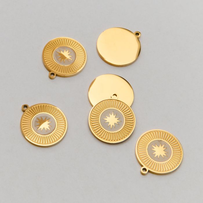 Emaliowana zawieszka ze stali chirurgicznej róża wiatrów na białym tle w kolorze złotym 14,5mm PVD