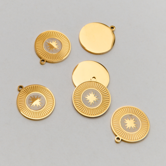 Emaliowana zawieszka ze stali chirurgicznej róża wiatrów na białym tle w kolorze złotym 14,5mm PVDTo trwały element biżuterii lub półfabrykat jubilerski, który dobrze sprawdza się w codziennych realizacjach. Stal chirurgiczna 316L dobrze sprawdza się w biżuterii noszonej na co dzień, ponieważ łączy trwałość z estetycznym wykończeniem. Wykończenie w kolorze złotym uzyskane metodą PVD.Zawieszka ze stali chirurgicznej 316L to dekoracyjny element, który nadaje biżuterii charakteru i pozwala tworzyć spersonalizowane projekty. Świetnie sprawdza się w naszyjnikach, bransoletkach, kolczykach oraz drobnych charmsach.Forma lub motyw