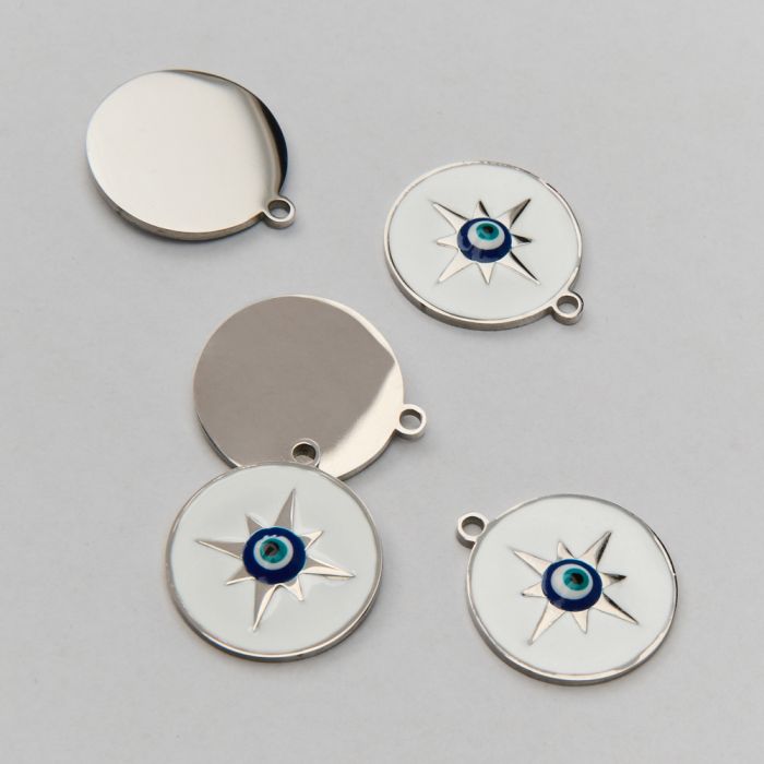 Emaliowana zawieszka ze stali chirurgicznej róża wiatrów w stylu greckim z okiem proroka w kolorze srebrnym 18mm