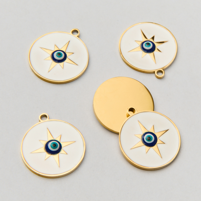 Emaliowana zawieszka ze stali chirurgicznej róża wiatrów w stylu greckim z okiem proroka w kolorze złotym 18mm PVDTo trwały element biżuterii lub półfabrykat jubilerski, który dobrze sprawdza się w codziennych realizacjach. Stal chirurgiczna 316L dobrze sprawdza się w biżuterii noszonej na co dzień, ponieważ łączy trwałość z estetycznym wykończeniem. Wykończenie w kolorze złotym uzyskane metodą PVD.Zawieszka ze stali chirurgicznej 316L to dekoracyjny element, który nadaje biżuterii charakteru i pozwala tworzyć spersonalizowane projekty. Świetnie sprawdza się w naszyjnikach, bransoletkach, kolczykach oraz drobnych charmsach.Forma lub motyw