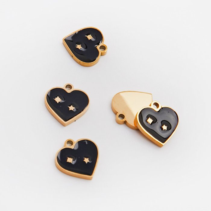 Emaliowana zawieszka ze stali chirurgicznej serce z gwiazdkami czarne w kolorze złotym 10mm PVDTo estetyczny element biżuteryjny ze stali chirurgicznej 316L, chętnie wybierany do nowoczesnych projektów. To materiał chętnie wybierany do biżuterii handmade ze względu na trwałość, estetykę i wygodę użytkowania. Wykończenie w kolorze złotym uzyskane metodą PVD.Zawieszka ze stali chirurgicznej 316L to dekoracyjny element, który nadaje biżuterii charakteru i pozwala tworzyć spersonalizowane projekty. Świetnie sprawdza się w naszyjnikach, bransoletkach, kolczykach oraz drobnych charmsach.Forma lub motyw