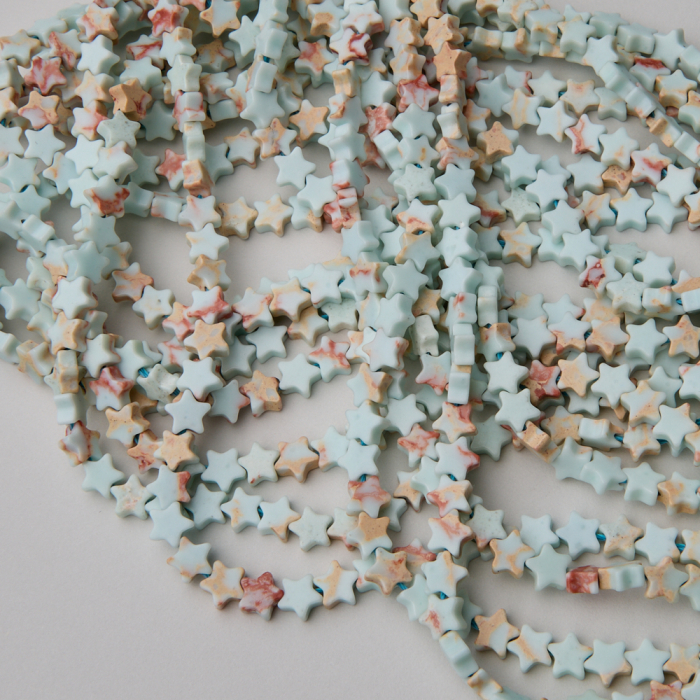 Jaspis cesarski turkusowy gwiazdka wyróżnia się tym, że bogate, nieregularne rysunki i dekoracyjna kolorystyka wyróżniają go na tle innych kamieni. Nadaje projektom charakteru i dobrze wygląda w bransoletkach oraz naszyjnikach handmade.