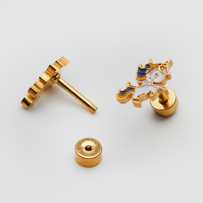 Kolczyki sztyfty dziecięce ze stali chirurgicznej jednorożec w kolorze złotym 6mm