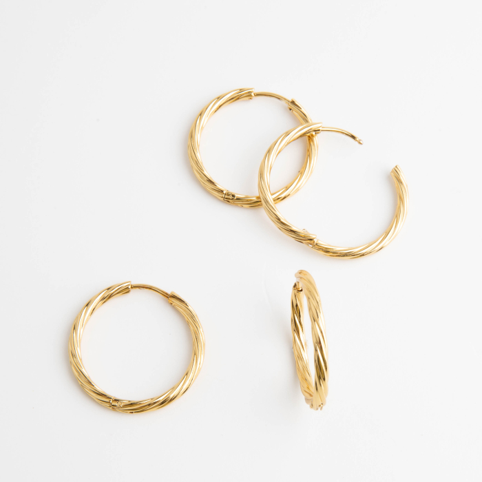 Kolczyki ze stali chirurgiczej skręcane koła w kolorze złotym 25mmTo estetyczny element biżuteryjny ze stali chirurgicznej 316L, chętnie wybierany do nowoczesnych projektów. Stal chirurgiczna 316L jest ceniona za odporność na korozję i estetyczny wygląd w codziennym użytkowaniu.Element do kolczyków wykonany ze stali chirurgicznej 316L to praktyczna baza do tworzenia wygodnej i trwałej biżuterii. Dzięki prostej formie można go wykorzystać zarówno w minimalistycznych projektach, jak i w bardziej ozdobnych kompozycjach z kamieniami, perłami lub zawieszkami.Rozmiar