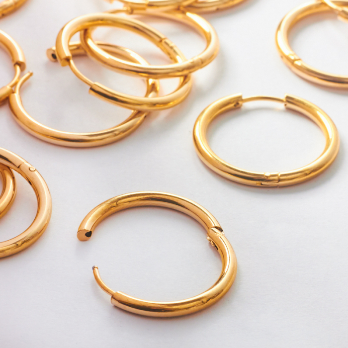Kolczyki ze stali chirurgicznej koła w kolorze złotym 25mmTo estetyczny element biżuteryjny ze stali chirurgicznej 316L, chętnie wybierany do nowoczesnych projektów. W biżuterii handmade stal chirurgiczna 316L jest ceniona za dobry wygląd, odporność na korozję i wygodę codziennego użytkowania.Element do kolczyków wykonany ze stali chirurgicznej 316L to praktyczna baza do tworzenia wygodnej i trwałej biżuterii. Dzięki prostej formie można go wykorzystać zarówno w minimalistycznych projektach, jak i w bardziej ozdobnych kompozycjach z kamieniami, perłami lub zawieszkami.Rozmiar