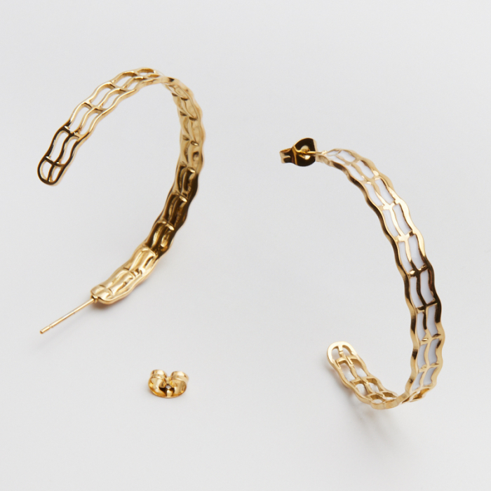 Kolczyki ze stali chirurgicznej koło ozdobne z białą emalią w kolorze złotym 40mm PVDTo starannie wykonany produkt ze stali chirurgicznej 316L, który dobrze prezentuje się w codziennym użytkowaniu. Stal chirurgiczna 316L dobrze sprawdza się w biżuterii noszonej na co dzień, ponieważ łączy trwałość z estetycznym wykończeniem. Wykończenie w kolorze złotym uzyskane metodą PVD.Element do kolczyków wykonany ze stali chirurgicznej 316L to praktyczna baza do tworzenia wygodnej i trwałej biżuterii. Dzięki prostej formie można go wykorzystać zarówno w minimalistycznych projektach, jak i w bardziej ozdobnych kompozycjach z kamieniami, perłami lub zawieszkami.Rozmiar