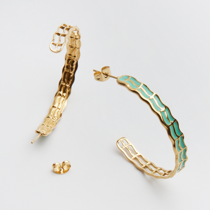 Kolczyki ze stali chirurgicznej koło ozdobne z turkusową emalią w kolorze złotym 40mm PVDTo estetyczny element biżuteryjny ze stali chirurgicznej 316L, chętnie wybierany do nowoczesnych projektów. To materiał chętnie wybierany do biżuterii handmade ze względu na trwałość, estetykę i wygodę użytkowania. Wykończenie w kolorze złotym uzyskane metodą PVD.Element do kolczyków wykonany ze stali chirurgicznej 316L to praktyczna baza do tworzenia wygodnej i trwałej biżuterii. Dzięki prostej formie można go wykorzystać zarówno w minimalistycznych projektach, jak i w bardziej ozdobnych kompozycjach z kamieniami, perłami lub zawieszkami.Rozmiar