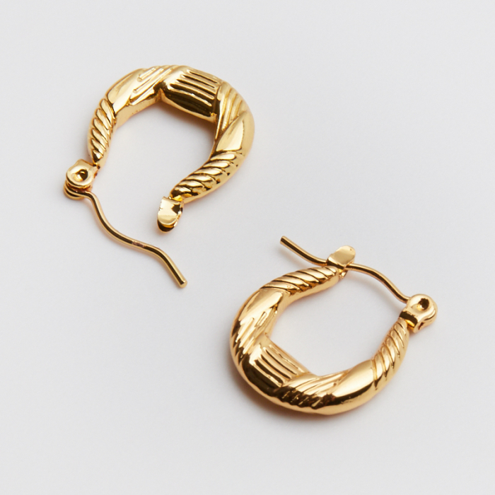Kolczyki ze stali chirurgicznej ozdobna podkowa w paski w kolorze złotym 18mm PVDTo trwały element biżuterii lub półfabrykat jubilerski, który dobrze sprawdza się w codziennych realizacjach. Stal chirurgiczna 316L jest ceniona za odporność na korozję i estetyczny wygląd w codziennym użytkowaniu. Wykończenie w kolorze złotym uzyskane metodą PVD.Element do kolczyków wykonany ze stali chirurgicznej 316L to praktyczna baza do tworzenia wygodnej i trwałej biżuterii. Dzięki prostej formie można go wykorzystać zarówno w minimalistycznych projektach, jak i w bardziej ozdobnych kompozycjach z kamieniami, perłami lub zawieszkami.Rozmiar