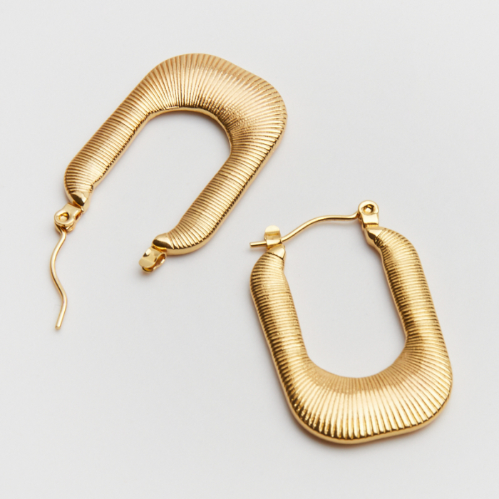 Kolczyki ze stali chirurgicznej ozdobny prostokąt w kolorze złotym 31,5mm PVDTo dopracowany produkt ze stali chirurgicznej 316L, który łączy praktyczność z estetycznym wyglądem. Stal chirurgiczna 316L dobrze sprawdza się w biżuterii noszonej na co dzień, ponieważ łączy trwałość z estetycznym wykończeniem. Wykończenie w kolorze złotym uzyskane metodą PVD.Element do kolczyków wykonany ze stali chirurgicznej 316L to praktyczna baza do tworzenia wygodnej i trwałej biżuterii. Dzięki prostej formie można go wykorzystać zarówno w minimalistycznych projektach, jak i w bardziej ozdobnych kompozycjach z kamieniami, perłami lub zawieszkami.Rozmiar