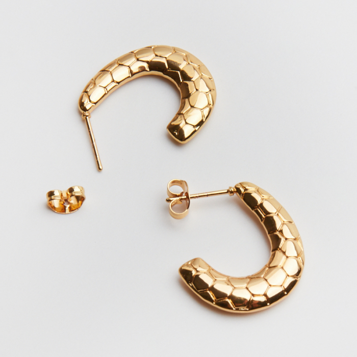 Kolczyki ze stali chirurgicznej skóra węża w kolorze złotym 23mm PVDTo trwały element biżuterii lub półfabrykat jubilerski, który dobrze sprawdza się w codziennych realizacjach. Stal chirurgiczna 316L jest ceniona za odporność na korozję i estetyczny wygląd w codziennym użytkowaniu. Wykończenie w kolorze złotym uzyskane metodą PVD.Element do kolczyków wykonany ze stali chirurgicznej 316L to praktyczna baza do tworzenia wygodnej i trwałej biżuterii. Dzięki prostej formie można go wykorzystać zarówno w minimalistycznych projektach, jak i w bardziej ozdobnych kompozycjach z kamieniami, perłami lub zawieszkami.Rozmiar