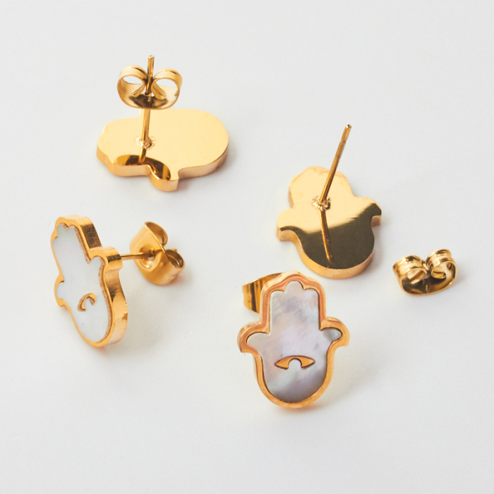 Kolczyki ze stali chirurgicznej z masą perłową ręka fatimy w kolorze złotym 14x11mm