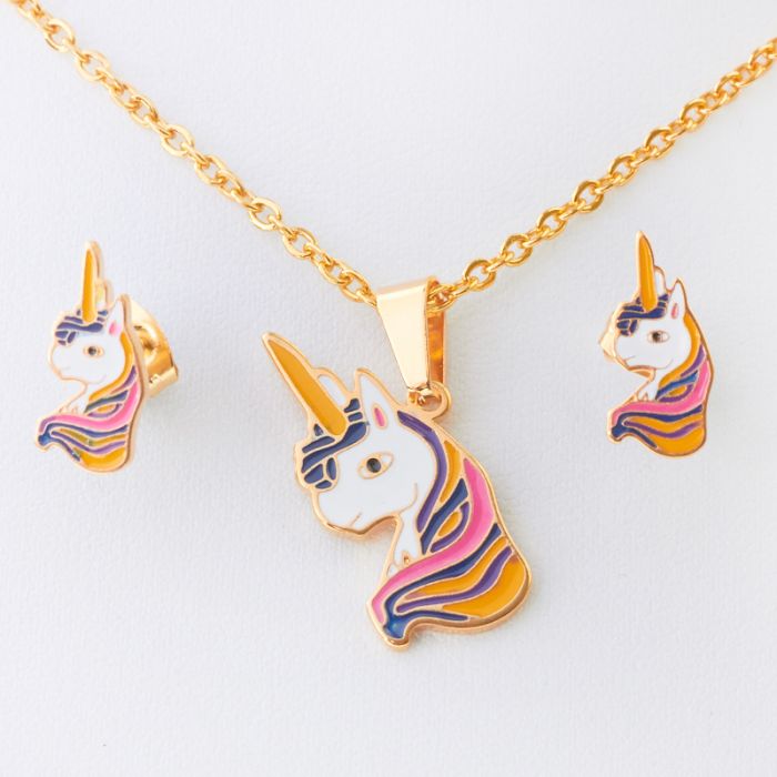 Komplet biżuterii z jednorożcem ze stali chirurgicznej w kolorze złotym 45cm