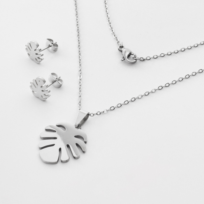 Komplet biżuterii ze stali chirurgicznej liść monstery w kolorze srebrnym 45cmTo dopracowany produkt ze stali chirurgicznej 316L, który łączy praktyczność z estetycznym wyglądem. To materiał chętnie wybierany do biżuterii handmade ze względu na trwałość, estetykę i wygodę użytkowania.Komplet biżuterii ze stali chirurgicznej 316L to spójnie zaprojektowany zestaw, który łączy estetykę z wygodą codziennego użytkowania. Dzięki dopasowanym elementom dobrze prezentuje się jako gotowa biżuteria i ułatwia stworzenie harmonijnej stylizacji.Rozmiar