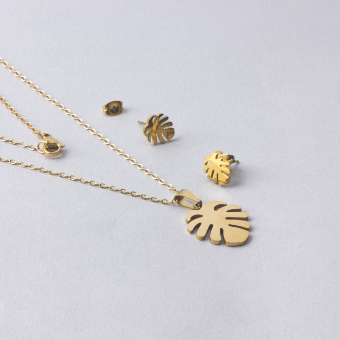 Komplet biżuterii ze stali chirurgicznej liść monstery w kolorze złotym 45cmTo dopracowany produkt ze stali chirurgicznej 316L, który łączy praktyczność z estetycznym wyglądem. Stal chirurgiczna 316L jest ceniona za odporność na korozję i estetyczny wygląd w codziennym użytkowaniu.Komplet biżuterii ze stali chirurgicznej 316L to spójnie zaprojektowany zestaw, który łączy estetykę z wygodą codziennego użytkowania. Dzięki dopasowanym elementom dobrze prezentuje się jako gotowa biżuteria i ułatwia stworzenie harmonijnej stylizacji.Rozmiar