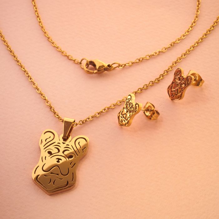 Komplet biżuterii ze stali chirurgicznej z kolczykami buldog w kolorze złotym 45cm