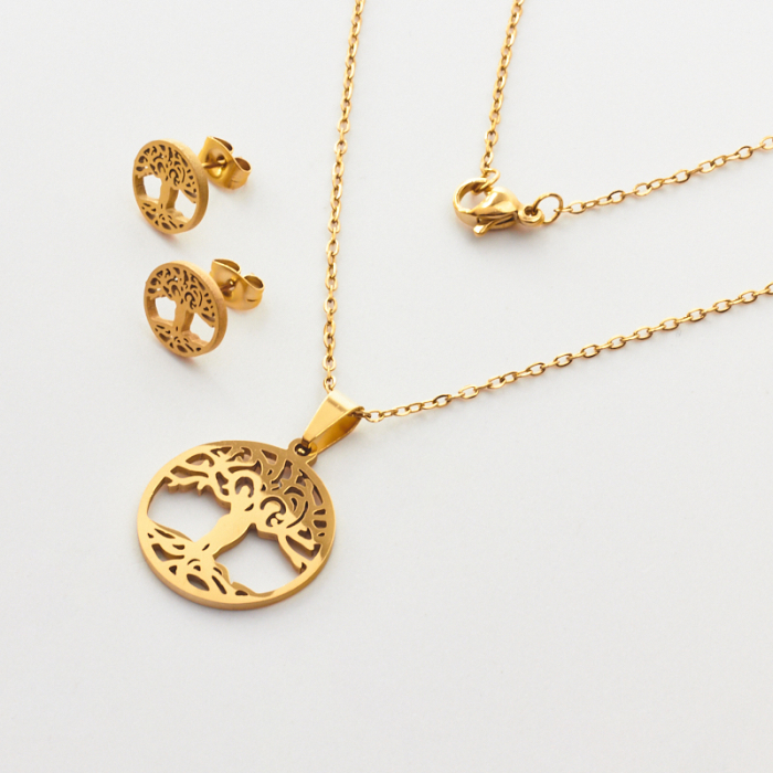 Komplet biżuterii ze stali chirurgicznej z kolczykami drzewo rodziny w kolorze złotym 45cmTo estetyczny element biżuteryjny ze stali szlachetnej, chętnie wybierany do nowoczesnych projektów. W biżuterii handmade stal szlachetna jest ceniona za dobry wygląd, odporność na korozję i wygodę codziennego użytkowania.Komplet biżuterii ze stali szlachetnej to spójnie zaprojektowany zestaw, który łączy estetykę z wygodą codziennego użytkowania. Dzięki dopasowanym elementom dobrze prezentuje się jako gotowa biżuteria i ułatwia stworzenie harmonijnej stylizacji.Rozmiar