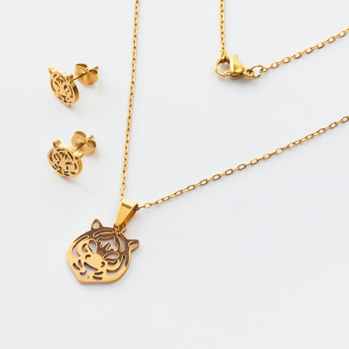 Komplet biżuterii ze stali chirurgicznej z kolczykami głowa tygrysa w kolorze złotym 45cmTo dopracowany produkt ze stali szlachetnej, który łączy praktyczność z estetycznym wyglądem. Stal szlachetna jest ceniona za odporność na korozję i estetyczny wygląd w codziennym użytkowaniu.Komplet biżuterii ze stali szlachetnej to spójnie zaprojektowany zestaw, który łączy estetykę z wygodą codziennego użytkowania. Dzięki dopasowanym elementom dobrze prezentuje się jako gotowa biżuteria i ułatwia stworzenie harmonijnej stylizacji.Rozmiar