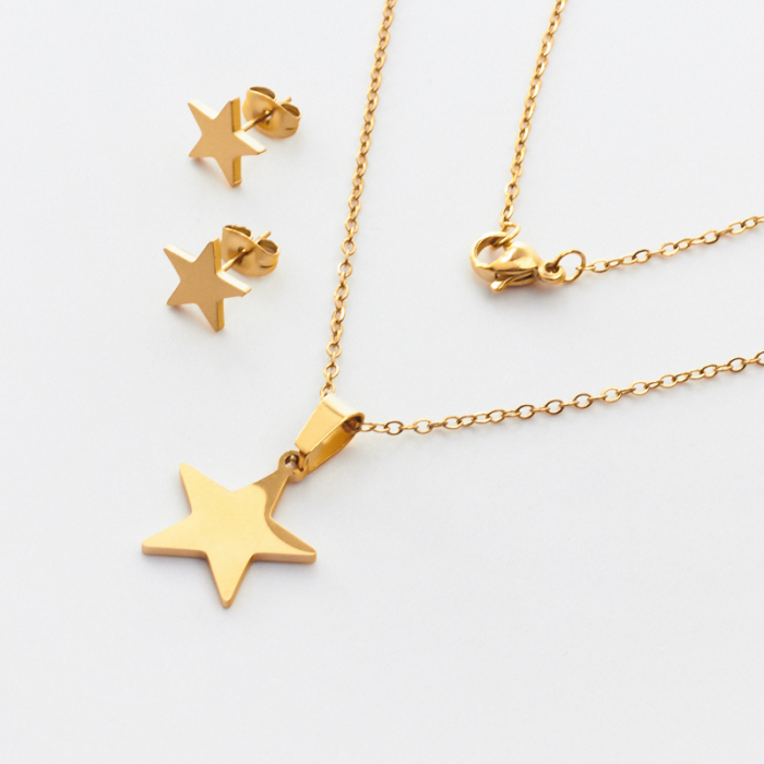 Komplet biżuterii ze stali chirurgicznej z kolczykami gwiazdka w kolorze złotym 45cmTo dopracowany produkt ze stali chirurgicznej 316L, który łączy praktyczność z estetycznym wyglądem. To materiał chętnie wybierany do biżuterii handmade ze względu na trwałość, estetykę i wygodę użytkowania.Komplet biżuterii ze stali chirurgicznej 316L to spójnie zaprojektowany zestaw, który łączy estetykę z wygodą codziennego użytkowania. Dzięki dopasowanym elementom dobrze prezentuje się jako gotowa biżuteria i ułatwia stworzenie harmonijnej stylizacji.Rozmiar