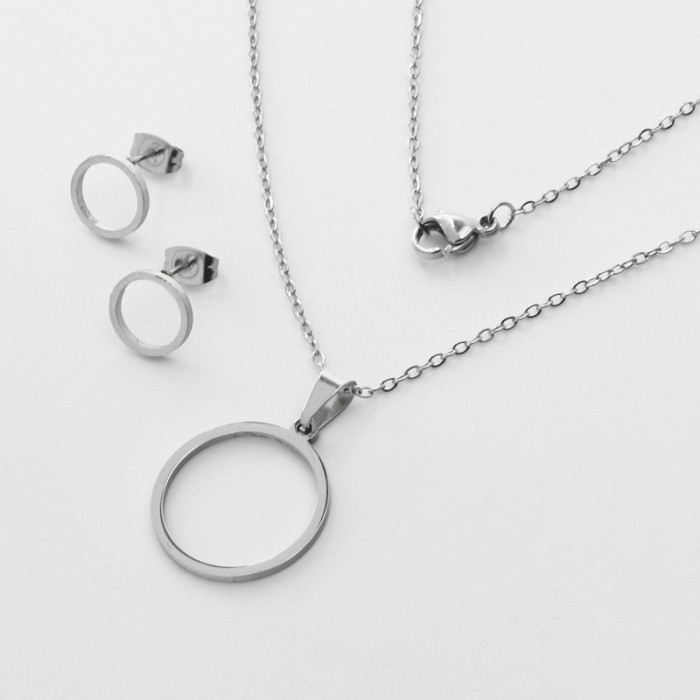 Komplet biżuterii ze stali chirurgicznej z kolczykami koło wycięte w kolorze srebrnym 45cmTo trwały element biżuterii lub półfabrykat jubilerski, który dobrze sprawdza się w codziennych realizacjach. Stal chirurgiczna 316L dobrze sprawdza się w biżuterii noszonej na co dzień, ponieważ łączy trwałość z estetycznym wykończeniem.Komplet biżuterii ze stali chirurgicznej 316L to spójnie zaprojektowany zestaw, który łączy estetykę z wygodą codziennego użytkowania. Dzięki dopasowanym elementom dobrze prezentuje się jako gotowa biżuteria i ułatwia stworzenie harmonijnej stylizacji.Rozmiar