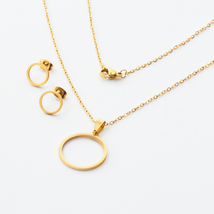 Komplet biżuterii ze stali chirurgicznej z kolczykami koło wycięte w kolorze złotym 45cmTo dopracowany produkt ze stali chirurgicznej 316L, który łączy praktyczność z estetycznym wyglądem. To materiał chętnie wybierany do biżuterii handmade ze względu na trwałość, estetykę i wygodę użytkowania.Komplet biżuterii ze stali chirurgicznej 316L to spójnie zaprojektowany zestaw, który łączy estetykę z wygodą codziennego użytkowania. Dzięki dopasowanym elementom dobrze prezentuje się jako gotowa biżuteria i ułatwia stworzenie harmonijnej stylizacji.Rozmiar