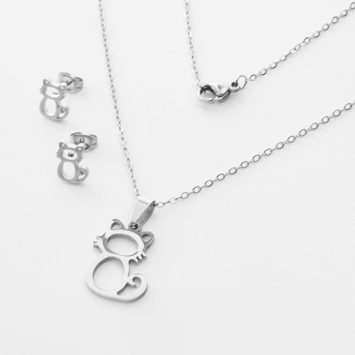 Komplet biżuterii ze stali chirurgicznej z kolczykami kotek w kolorze srebrnym 45cmTo estetyczny element biżuteryjny ze stali chirurgicznej 316L, chętnie wybierany do nowoczesnych projektów. To materiał chętnie wybierany do biżuterii handmade ze względu na trwałość, estetykę i wygodę użytkowania.Komplet biżuterii ze stali chirurgicznej 316L to spójnie zaprojektowany zestaw, który łączy estetykę z wygodą codziennego użytkowania. Dzięki dopasowanym elementom dobrze prezentuje się jako gotowa biżuteria i ułatwia stworzenie harmonijnej stylizacji.Rozmiar