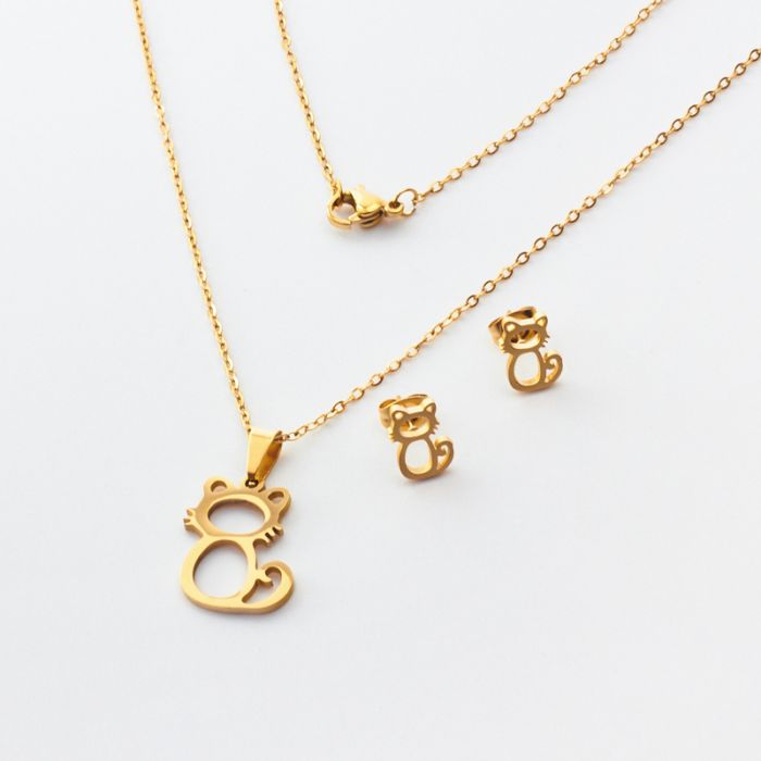 Komplet biżuterii ze stali chirurgicznej z kolczykami kotek w kolorze złotym 45cm