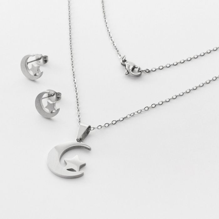 Komplet biżuterii ze stali chirurgicznej z kolczykami księżyc z gwiazdką w kolorze srebrnym 45cm