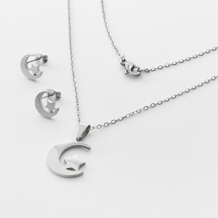 Komplet biżuterii ze stali chirurgicznej z kolczykami księżyc z gwiazdką w kolorze srebrnym 45cmTo estetyczny element biżuteryjny ze stali chirurgicznej 316L, chętnie wybierany do nowoczesnych projektów. Stal chirurgiczna 316L dobrze sprawdza się w biżuterii noszonej na co dzień, ponieważ łączy trwałość z estetycznym wykończeniem.Komplet biżuterii ze stali chirurgicznej 316L to spójnie zaprojektowany zestaw, który łączy estetykę z wygodą codziennego użytkowania. Dzięki dopasowanym elementom dobrze prezentuje się jako gotowa biżuteria i ułatwia stworzenie harmonijnej stylizacji.Rozmiar