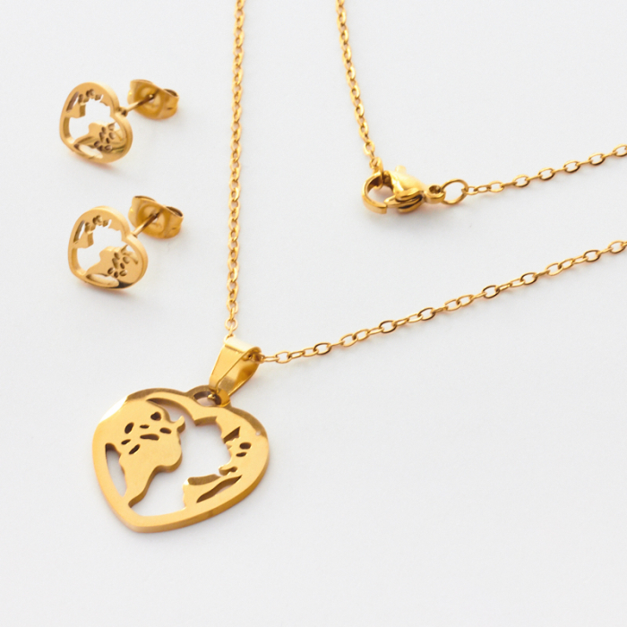 Komplet biżuterii ze stali chirurgicznej z kolczykami kula ziemska w serduszku w kolorze złotym 45cmTo trwały element biżuterii lub półfabrykat jubilerski, który dobrze sprawdza się w codziennych realizacjach. To materiał chętnie wybierany do biżuterii handmade ze względu na trwałość, estetykę i wygodę użytkowania.Komplet biżuterii ze stali chirurgicznej 316L to spójnie zaprojektowany zestaw, który łączy estetykę z wygodą codziennego użytkowania. Dzięki dopasowanym elementom dobrze prezentuje się jako gotowa biżuteria i ułatwia stworzenie harmonijnej stylizacji.Rozmiar