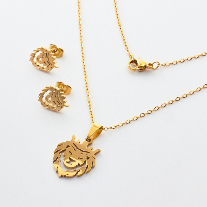 Komplet biżuterii ze stali chirurgicznej z kolczykami lew w kolorze złotym 45cmTo starannie wykonany produkt ze stali szlachetnej, który dobrze prezentuje się w codziennym użytkowaniu. Stal szlachetna dobrze sprawdza się w biżuterii noszonej na co dzień, ponieważ łączy trwałość z estetycznym wykończeniem.Komplet biżuterii ze stali szlachetnej to spójnie zaprojektowany zestaw, który łączy estetykę z wygodą codziennego użytkowania. Dzięki dopasowanym elementom dobrze prezentuje się jako gotowa biżuteria i ułatwia stworzenie harmonijnej stylizacji.Rozmiar