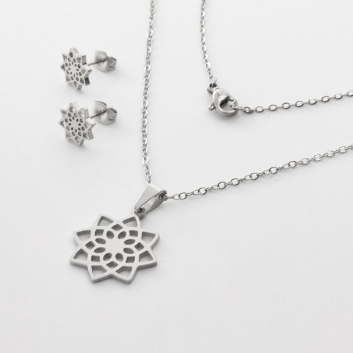 Komplet biżuterii ze stali chirurgicznej z kolczykami mandala w kolorze srebrnym 45cm