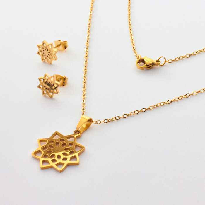 Komplet biżuterii ze stali chirurgicznej z kolczykami mandala w kolorze złotym 45cmTo starannie wykonany produkt ze stali chirurgicznej 316L, który dobrze prezentuje się w codziennym użytkowaniu. To materiał chętnie wybierany do biżuterii handmade ze względu na trwałość, estetykę i wygodę użytkowania.Komplet biżuterii ze stali chirurgicznej 316L to spójnie zaprojektowany zestaw, który łączy estetykę z wygodą codziennego użytkowania. Dzięki dopasowanym elementom dobrze prezentuje się jako gotowa biżuteria i ułatwia stworzenie harmonijnej stylizacji.Rozmiar