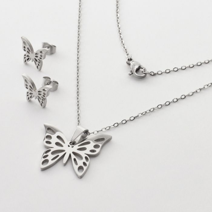 Komplet biżuterii ze stali chirurgicznej z kolczykami motyl w kolorze srebrnym 45cm