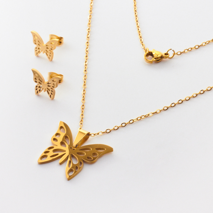 Komplet biżuterii ze stali chirurgicznej z kolczykami motyl w kolorze złotym 45cmTo estetyczny element biżuteryjny ze stali chirurgicznej 316L, chętnie wybierany do nowoczesnych projektów. To materiał chętnie wybierany do biżuterii handmade ze względu na trwałość, estetykę i wygodę użytkowania.Komplet biżuterii ze stali chirurgicznej 316L to spójnie zaprojektowany zestaw, który łączy estetykę z wygodą codziennego użytkowania. Dzięki dopasowanym elementom dobrze prezentuje się jako gotowa biżuteria i ułatwia stworzenie harmonijnej stylizacji.Rozmiar