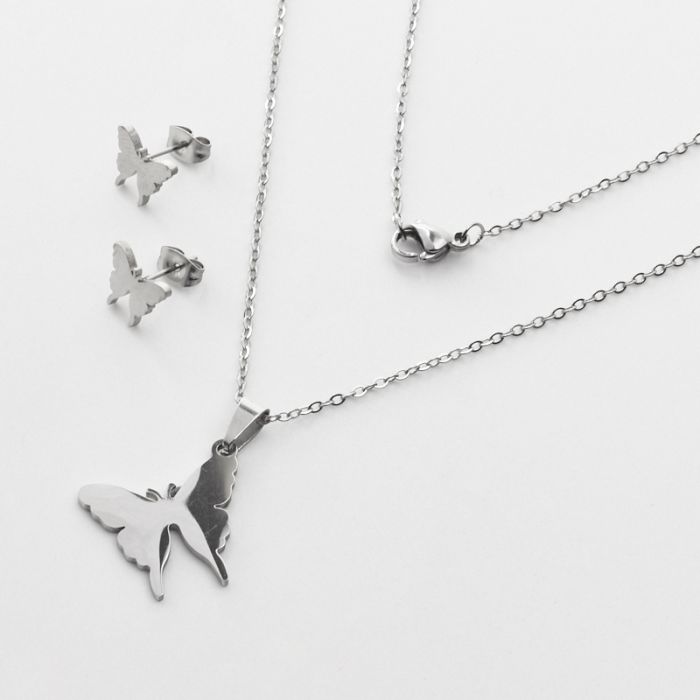 Komplet biżuterii ze stali chirurgicznej z kolczykami motylek w kolorze srebrnym 45cm