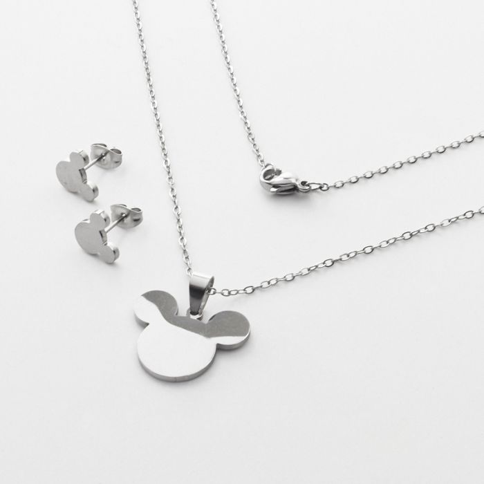 Komplet biżuterii ze stali chirurgicznej z kolczykami Myszka Miki w kolorze srebrnym 45cm
